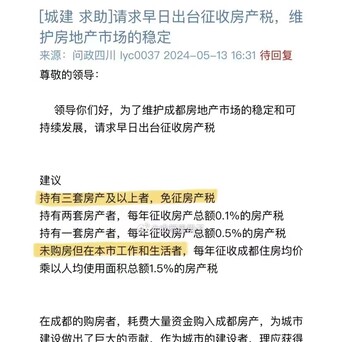 有成都人在“问政四川”留言,请求政府早日出台征收“不买房税”,维护房地产市场。此事引发网友激情讨论,有人建议“可以送精神病院”,认为是炒房客亏到失心疯了,有人说这是张献忠进川了…